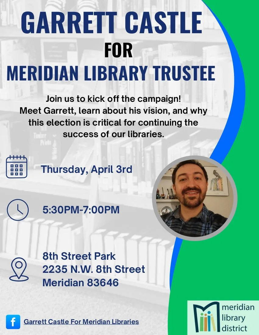 Garrett Castle for Meridian Library Trustee Thursday, April 3, 2025 5:30 PM 7:00 PM 8th Street Park 2235 8th Street Northwest Meridian, ID, 83646 United States (map) Google Calendar ICS Join us to kick off the campaign!Meet Garrett, learn about his vision, and why this election is critical for continuing the success of our libraries.FacebookDonate!